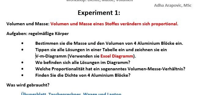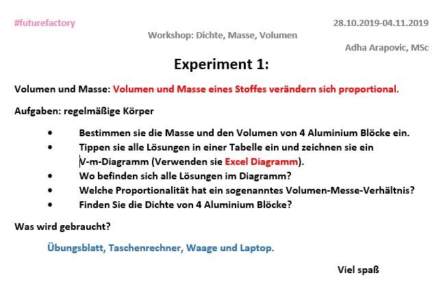 Zu Beginn des Workshops hat uns die Trainerin den theoretischen Teil zu dem Thema kurz erklärt. Anschließend durften wir unser neu erworbenes Wissen durch Experimente testen. Wir haben zu den ersten zwei Experimenten Aufgaben zu den regelmäßigen und unregelmäßigen Körpern bekommen. Zur Volumenbestimmung der unregelmäßigen Körper haben wir die Methode Wasserverdrängung verwendet. Der untersuchende Körper wurde in ein vollständig mit Wasser gefülltes Gefäß getaucht und das Volumen des verdrängten Wassers in einem Gesäß bekannten Volumens bestimmt.