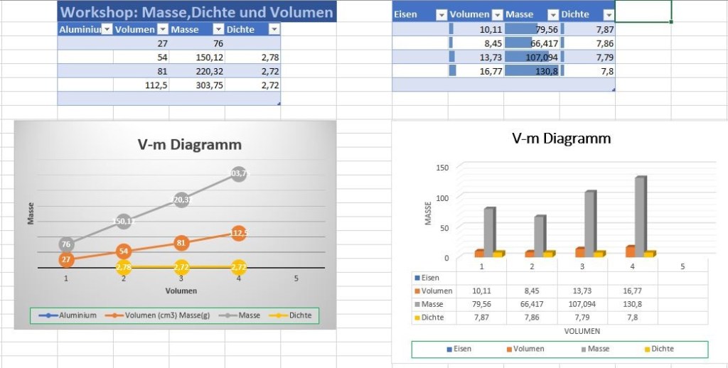 Nachdem wir die Materialien (Holz, Aluminium, Schwamm, Plastik, unregelmäßiger Eisen-Stuck, Zitrone und Deko-Kristallsteine usw.) abgemessen und abgewogen hatten, rechneten wir das Volumen, Masse und die Dichte aus und trugen die Daten daraufhin in einer V-m Tabelle auf Excel ein. Danach haben wir mit den Daten V-m-Diagramme wieder in Excel erstellt und darüber diskutiert.