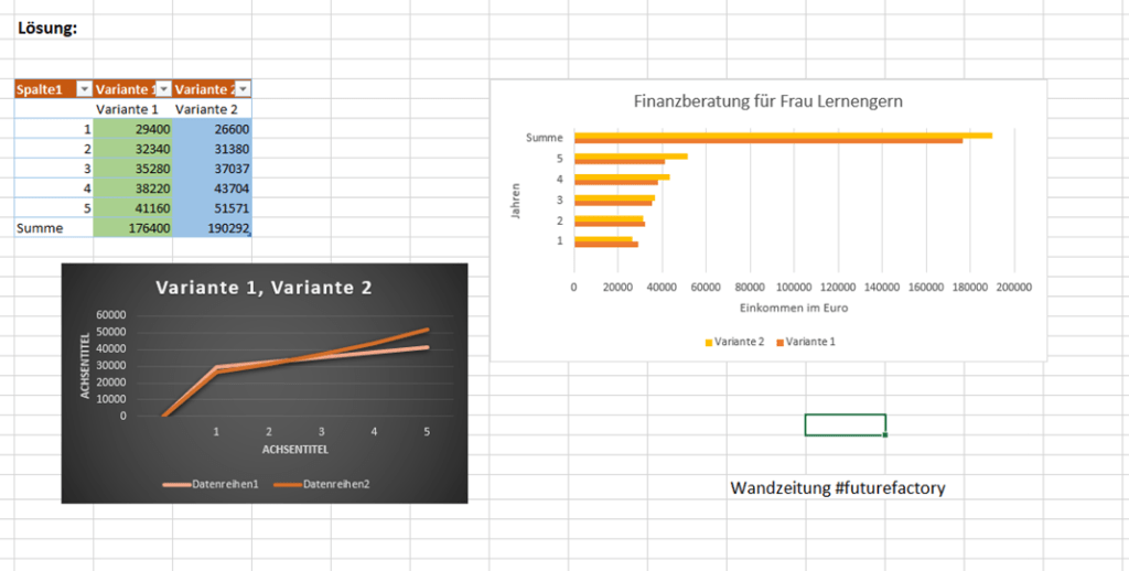 Constanze & Wiktoria sind die Finanzberaterinnen von Frau Lernengern. Sie sollten eine Empfehlung abgeben unter der Annahme, dass Frau Lernengern fünf volle Jahre bei der futurefactory arbeiten soll.