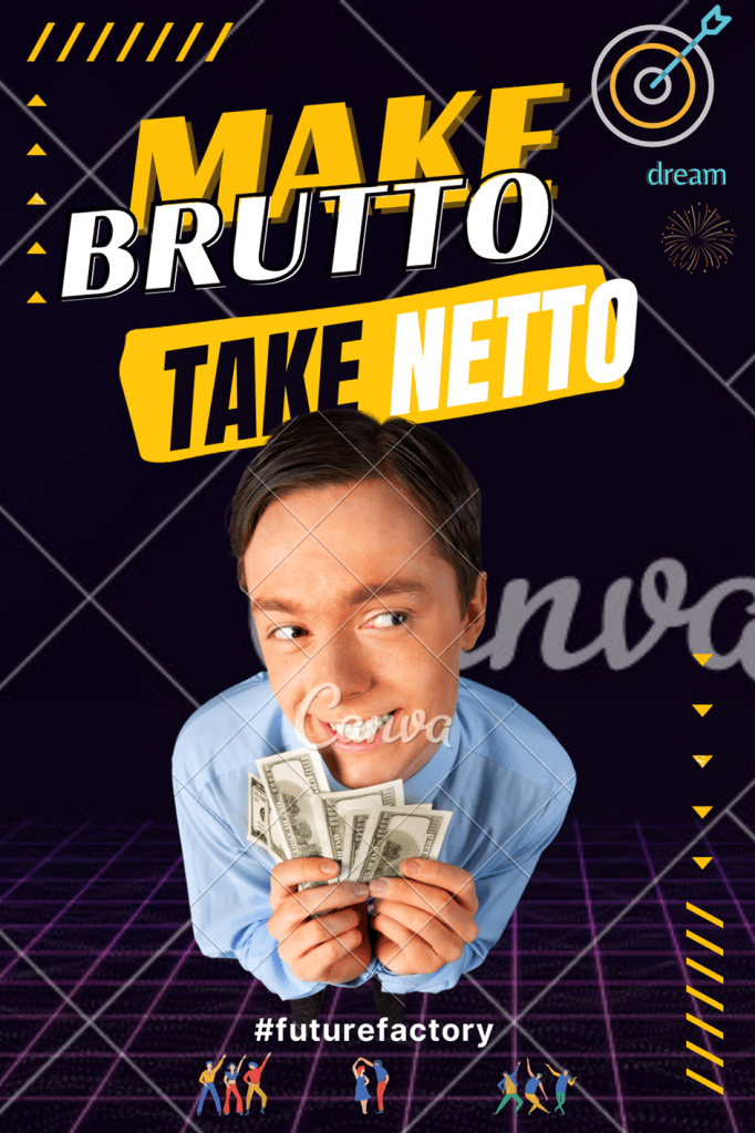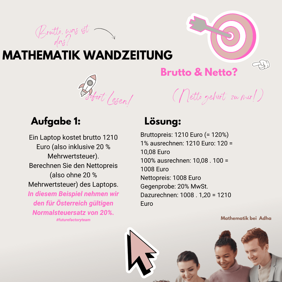 Ich bin Sarah. In der Redaktion der Wandzeitung #futurefactory habe ich mich zusammen mit Albine und Frau Arapovic mit dem Thema Brutto-Netto-Berechnung beschäftigt. Die Ergebnisse wurden in der Canva-Grafikdesign-Plattform dargestellt. Mit der Design Applikation möchten wir ein mathematisches Thema bearbeiten und in einer modernen Form präsentieren.