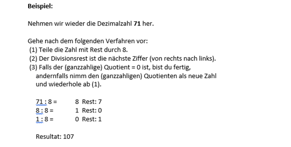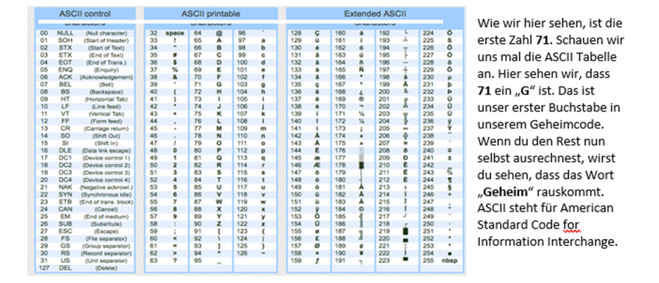 Die Oktal Tabelle ist lang. Es beinhaltet Zahlen von 0 bis 377. 107 wäre die Dezimalzahl 71. Also egal, welches Zahlensystem man vor sich hat, man wird immer ins Dezimal- oder Hexadezimalsystem umrechnen müssen. Aber nun weißt du, wie du verschiedene Geheimcodes ausrechnest. Du kannst nun versuchen, selbst einen Geheimcode zu erstellen. Viel Spaß!
