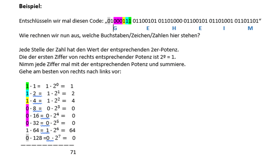 Die meisten von euch werden das Binärsystem schon mal gesehen haben. Das Binärsystem besteht nur aus zwei Zahlen, 0 und 1. Wie können wir denn Binärcodes entschlüsseln? Hierfür werdet ihr eine ASCII Tabelle brauchen. Hier ist ein kleines Beispiel, wie ihr einen Binärcode mithilfe von Mathematik entschlüsselt.