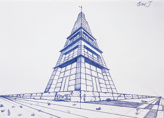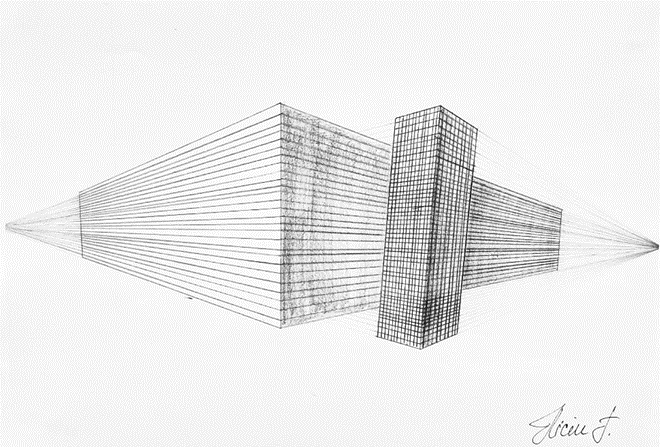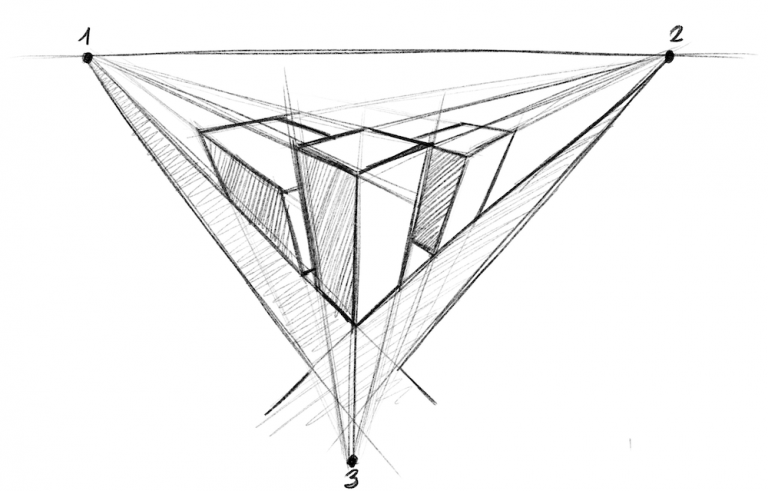Bei der 3-Punkt Perspektive werden drei Fluchtpunkte verwendet. Das Besondere beim Zeichnen mit der Dreipunktperspektive ist, dass man den Eindruck vermitteln kann, dass der Betrachter nach oben oder unten blickt.
