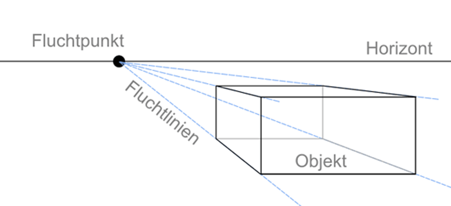 Die 1-Punkt Perspektive, oder auch Frontalperspektive, besitzt einen wesentlichen Fluchtpunkt (Hauptpunkt), mit der man das Objekt von vorne betrachtet.