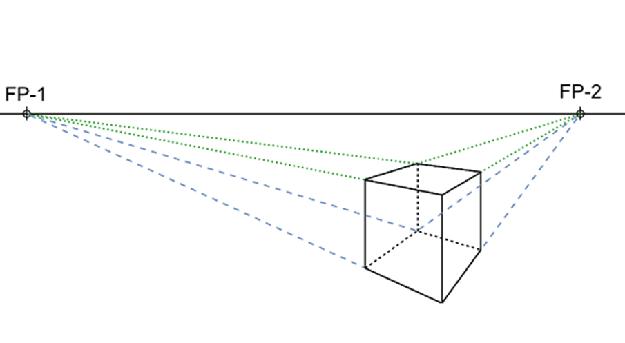 Bei der 2-Punkt Perspektive oder Eckperspektive werden zwei Fluchtpunkte verwendet. Das Objekt wird aus einer Ecke betrachtet.