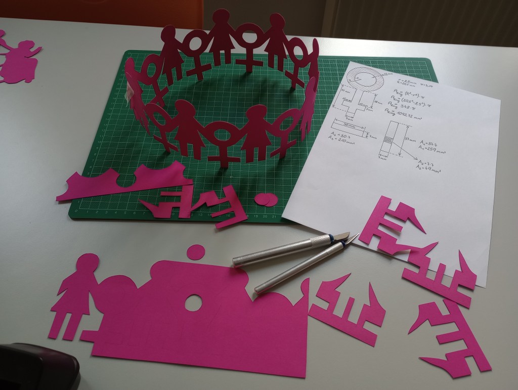 Schließlich entschieden wir uns für eine Technik, die tatsächlich Spaß bereitet und in jeder Lebenslage anwendbar ist: Die so genannte Kirigami-Technik. Dazu benötigt man einen farbigen Karton, ein Kartonmodell und – natürlich eine Schere zum Ausschneiden, mit etwas Fingerspitzengefühl gelingen die erstaunlichsten Dinge, die sich sogar als Dekoration oder als Geschenk sehr gut eignen.