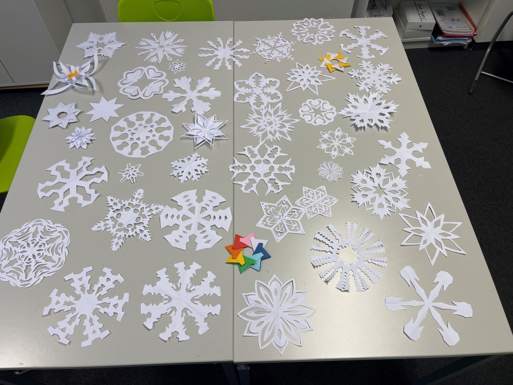 In der letzten Kurswoche vor der Winterpause schmückten wir mit selbst gemachten Sternen und Schneeflocken die Wände der Future Factory. Frau Arapovic stellte uns ihren Raum zur Verfügung, um uns kreativ auszutoben. Nebenbei erklang weihnachtliche Musik im Hintergrund, damit wir so richtig in Stimmung kommen. Dabei durften wir alle Materialien verwenden, die zu unserer Kreativität beitrugen. Das Basteln in kleinen Gruppen hatte etwas Meditatives an sich.