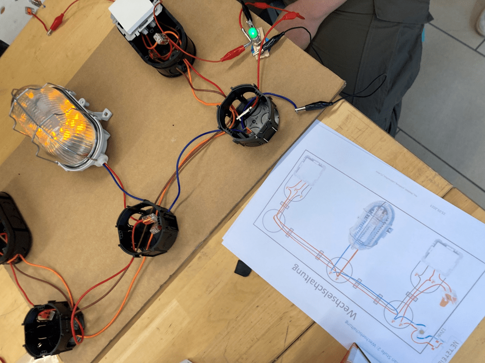 Wir haben unter anderem eine Wechselschaltung aufgebaut, so wie wir sie auch aus unserem eigenen Wohnraum kennen. Am Ende war unsere Beleuchtung von 2 Schaltern aus getrennt ein- und ausschaltbar und unsere Köpfe hatten beim Lesen der Schaltpläne ganz schön viel zu tun.