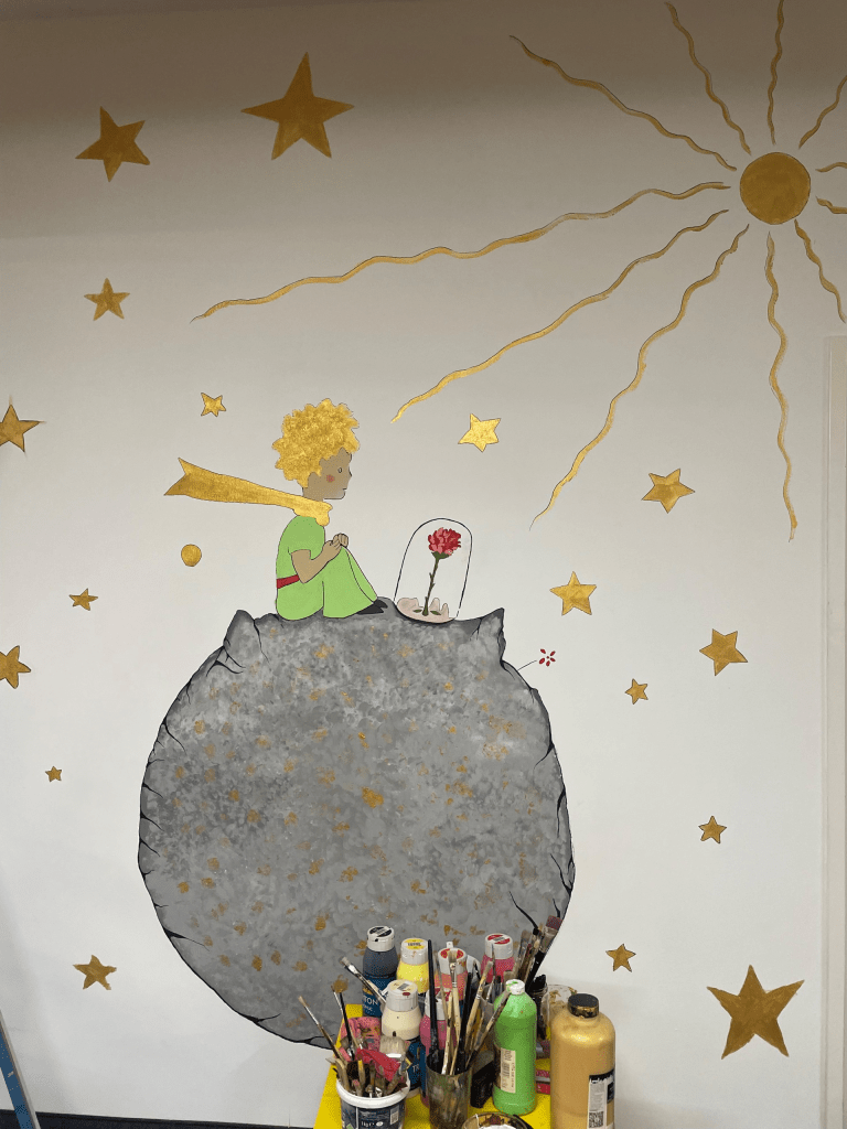 Ein Fußabdruck, der bleibt und uns daran erinnert, dass wir in der Lage sind über uns hinauszuwachsen. Für uns diente folgendes Zitat von „Antoine de Saint-Exupéry“ aus „Der Kleine Prinz“ als Inspiration für das Wandbild.